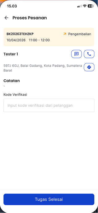 Akan muncul halaman Proses Pesanan. Sebelum meninggalkan lokasi pelanggan, minta kode verifikasi pesanan dari pelanggan.